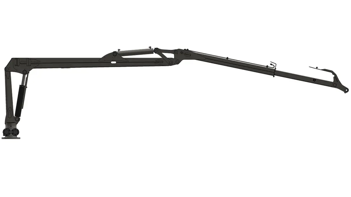 This crane has a reach of 6.3 m and an extension of 1.1 m. The crane lifts 500 kg at full reach, excluding the grapple, rotator and link.