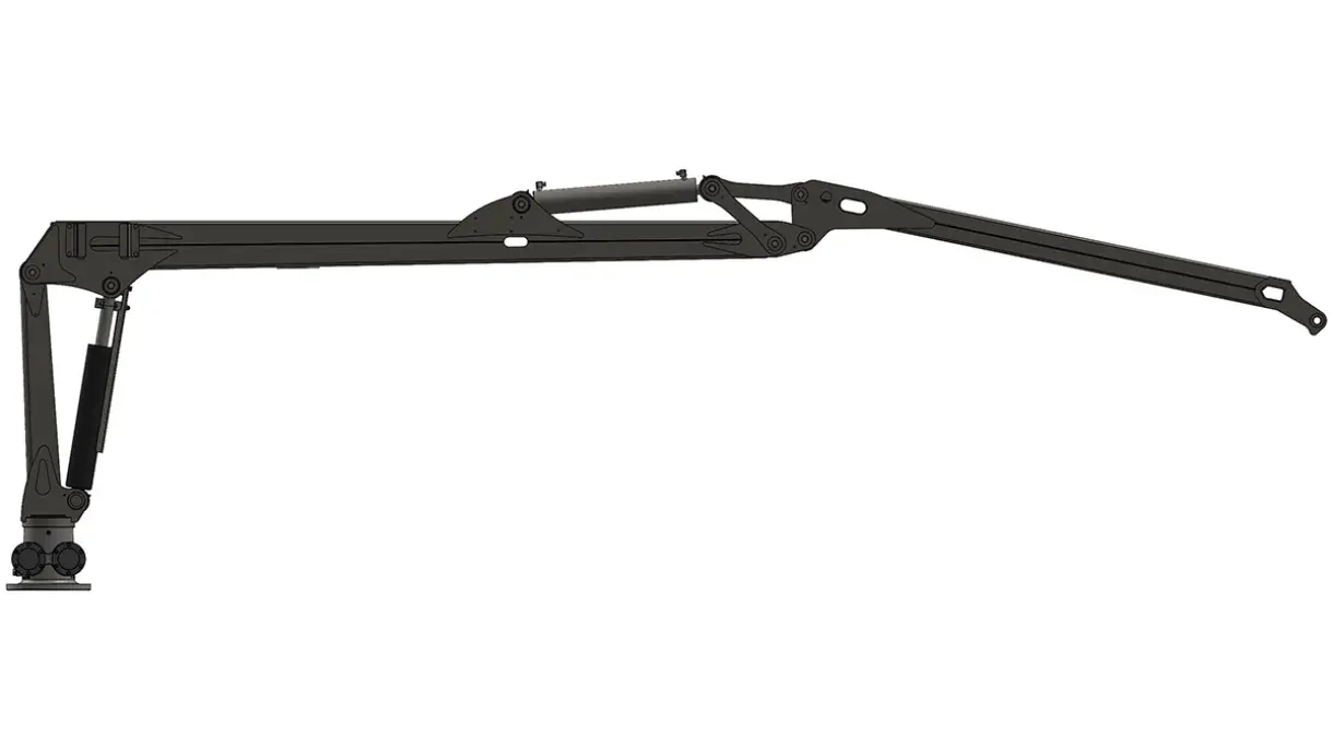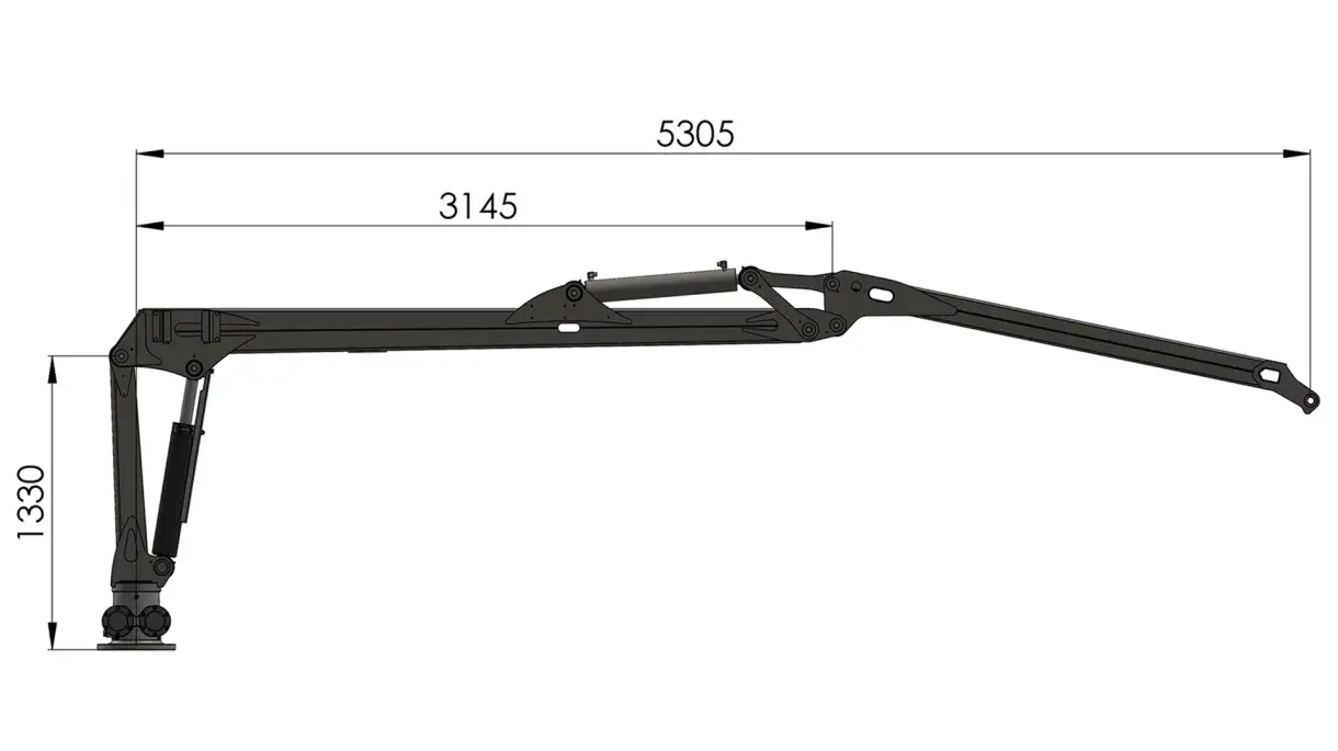 Cette grue a un rayon d’action de 5,3 m et peut soulever 615 kg à portée maximale, hors poids du grappin, du rotateur et de l’articulation.